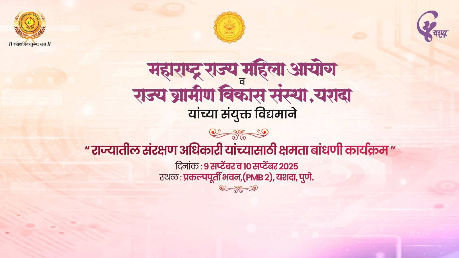 मुंबई दि. ८ सप्टेंबर – महाराष्ट्र राज्य महिला आयोग आणि यशवंतराव चव्हाण विकास प्रशासन प्रबोधिनी (यशदा), पुणे यांच्या संयुक्त विद्यमाने राज्यभरात महिला सुरक्षेसाठी कार्यरत असणारे संरक्षण अधिकारी यांचेसाठी दोन दिवसीय क्षमता बांधणी कार्यक्रम दि. ९ आणि १० सप्टेंबर २०२५ रोजी यशदा, पुणे येथे आयोजित करण्यात आले आहे.