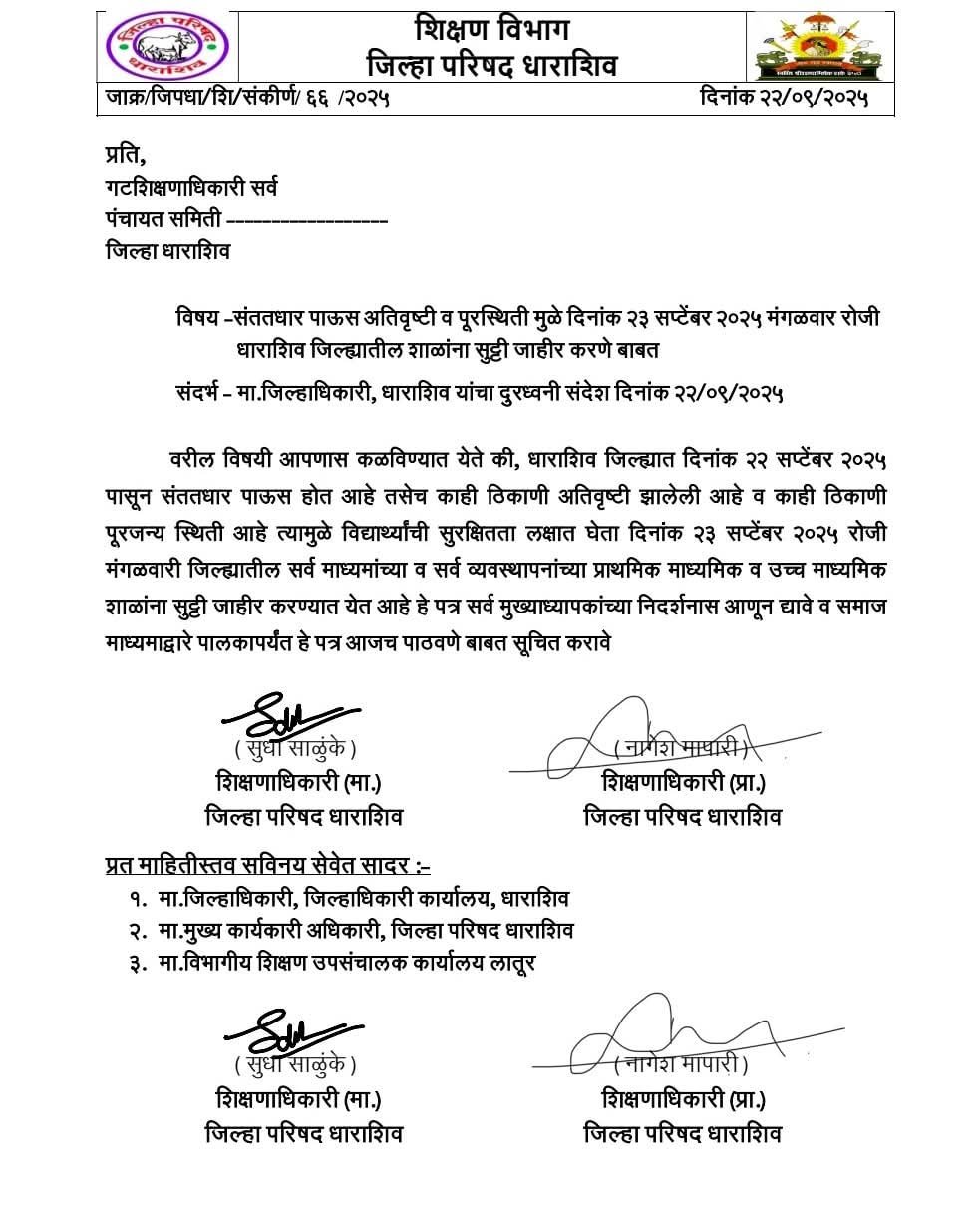 धाराशिव जिल्ह्यात अतिवृष्टीः विद्यार्थ्यांच्या सुरक्षिततेसाठी उद्या, २३ सप्टेंबर रोजी सर्व शाळांना सुट्टी जाहीर