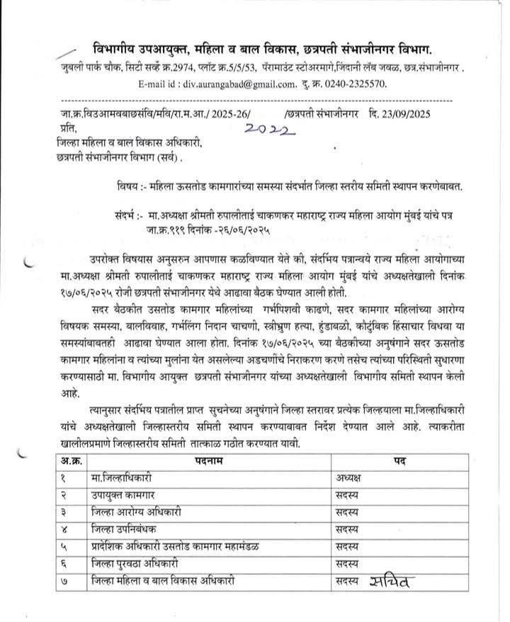 महाराष्ट्र राज्य महिला आयोगाच्या अध्यक्षा रूपाली चाकणकर यांनी ऊसतोड कामगार महिला आणि त्यांच्या मुलांच्या प्रश्नांसंबंधी छत्रपती संभाजी नगरच्या विभागीय आयुक्तांसह सर्व वरिष्ठ अधिकाऱ्यांची बैठक दिनांक १७ जून २०२५ रोजी छत्रपती संभाजी नगर येथे घेतली होती. मोठ्या प्रमाणावर ऊसतोड कामगार महिला कार्यरत असलेल्या जिल्ह्यांचा आढावा त्यांनी या बैठकीत घेतला होता. कामगार महिलांची गर्भपिशवी काढणे, बालविवाह, गर्भलिंगनिदान चाचणी, स्त्रीभ्रूण हत्या, कौटुंबिक हिंसाचार अशा विषयांचा आढावा घेतल्यानंतर त्याचे निराकरण करण्यासाठी विभागीय आणि प्रत्येक जिल्ह्यातही समिती स्थापन करण्याचे निर्देश त्यांनी दिले होते. त्यानुसार, जिल्हाधिकारी यांच्या अध्यक्षतेखाली उपायुक्त कामगार, जिल्हा आरोग्य अधिकारी, जिल्हा उपनिबंधक, प्रादेशिक अधिकारी ऊसतोड कामगार महामंडळ, जिल्हा पुरवठा अधिकारी आणि सदस्य सचिव म्हणून जिल्हा महिला बालविकास अधिकारी यांची समिती सर्व जिल्ह्यात स्थापन करण्यात आली आहे.