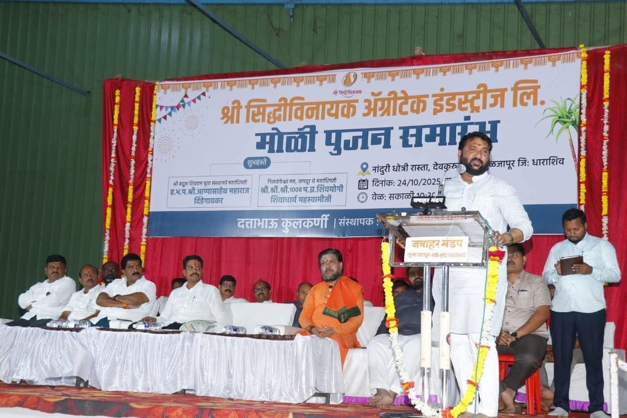 तुळजापूर – तालुक्यातील देवकुरळी येथील श्री सिद्धीविनायक ॲग्रीटेक इंडस्ट्रीज लि. कारखान्याच्या पाचव्या मोळी पूजनाचा सोहळा शुक्रवार, दिनांक २४ रोजी मोठ्या श्रद्धा आणि उत्साहात पार पडला. या वेळी अणदूर येथील श्री निळकंठेश्वर मठाचे मठाधिपती श्री.श्री.श्री. १००८ शिवयोगी शिवाचार्य महास्वामीजी तसेच श्री सद्गुरू शिवराम बुवा संस्थांचे ह.भ.प. विवेक महाराज दिंडेगावकर यांची प्रमुख उपस्थिती होती. सोहळ्यास श्री सिद्धीविनायक परिवाराचे संस्थापक अध्यक्ष दत्ताभाऊ कुलकर्णी, कारखान्याचे संचालक दिनेश कुलकर्णी, बालाजी कोरे, गणेश कामटे, राजकुमार जाधव, देविदास कुलकर्णी, ॲड. नितीन भोसले, देवकुरळीचे हनुमंत जाधव, पांडुरंग चव्हाण, बालाजी शिंदे, केशेगावचे सरपंच मल्लिनाथ गावडे, नारायण नन्नावरे, नागेश नाईक, राजाभाऊ पवार, दत्ताभाऊ राजमाने, साहेबराव घुगे, शिवाजी बोधले, आशिष सोनटक्के, अण्णासाहेब सरडे, विजय शिंगाडे, मंगेश कुलकर्णी, संजीव चिलवंत, मकरंद धोंगडे, शुभम मिंढे आदी मान्यवरांसह परिसरातील शेतकरी बांधव मोठ्या संख्येने उपस्थित होते. या प्रसंगी श्री सिद्धीविनायक परिवाराचे संस्थापक अध्यक्ष दत्ताभाऊ कुलकर्णी यांनी शेतकऱ्यांना सन्मानजनक भाव देणे, हेच आमचे प्रमुख ध्येय असून ऊस उत्पादक शेतकऱ्यांना विश्वासात घेऊनच कारखान्याचे काम पुढे नेऊ. तसेच आधुनिक AI तंत्रज्ञानाच्या माध्यमातून शेतकऱ्यांच्या ऐकरी ऊसवाढीसाठी प्रयत्न करणार असल्याचे स्पष्ट केले. यावेळी ह.भ.प. विवेक महाराज दिंडेगावकर आणि श्री श्री शिवयोगी शिवाचार्य महास्वामीजी यांनी कारखान्याच्या प्रगतीबद्दल समाधान व्यक्त करत श्री सिद्धीविनायक ॲग्रीटेक परिवाराचे कौतुक केले आणि पुढील वाटचालीसाठी विशेष शुभेच्छा दिल्या.