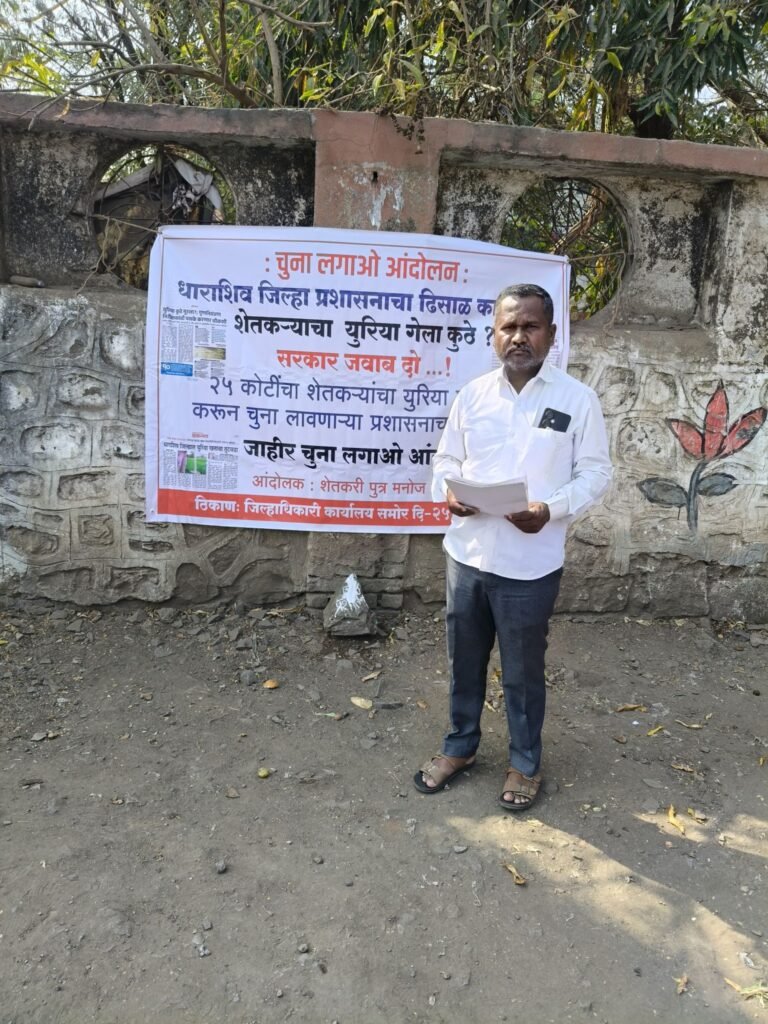 धाराशिव जिल्ह्यात युरिया खताचा कृत्रिम तुटवडा निर्माण झाला असून, यामुळे शेतकरी अडचणीत सापडले आहेत. याविरोधात शेतकरी पुत्र मनोज जाधव यांनी जिल्हाधिकारी कार्यालयासमोर रविवारी (दि.२५) चुना लावो आंदोलन केले. यापूर्वी त्यांनी दिनांक ६ डिसेंबर २०२५ रोजी जिल्हाधिकारी यांना निवेदन देऊन जिल्ह्यातील परिस्थिती निदर्शनास आणून दिली होती. मात्र त्यानंतरही शेतकऱ्यांना खत मिळत नसल्याचे समोर आले. याबाबत अधिक माहिती घेण्यासाठी मनोज जाधव यांनी जिल्हा परिषद येथील कृषी विकास अधिकारी कार्यालय तसेच प्रशासकीय इमारतीतील कृषी अधीक्षक कृषी अधिकारी कार्यालयात भेट दिली. या दोन्ही ठिकाणी एकही कर्मचारी उपलब्ध नसल्याचे निदर्शनास आले होते. त्यानंतर कृषी विभागाने कोणतीही ठोस दखल घेतली नसल्याचा आरोप त्यांनी केला. संबंधित अधिकारी एकमेकांकडे जबाबदारी ढकलत उडवा-उडवीची उत्तरे देत असून मागितलेली माहिती दिली जात नसल्याचे मनोज जाधव यांनी सांगितले. त्यांनी यासंदर्भात कृषी आयुक्तांनाही पत्र पाठवले; मात्र त्याचीही दखल न घेतल्याने शेतकऱ्यांची थट्टा होत असल्याचा आरोप त्यांनी केला. कृषी विभागाच्या प्रसिद्धीपत्रकांनुसार धाराशिव जिल्ह्यात सुमारे ८ हजार मेट्रिक टन युरिया खत शिल्लक असतानाही प्रत्यक्षात शेतकऱ्यांना खत मिळाले नाही. त्यामुळे या खतावर मिळणारी जवळपास २५ कोटी रुपयांची सबसिडी नेमकी कुणाच्या घशात गेली, असा गंभीर सवाल मनोज जाधव यांनी उपस्थित केला आहे.