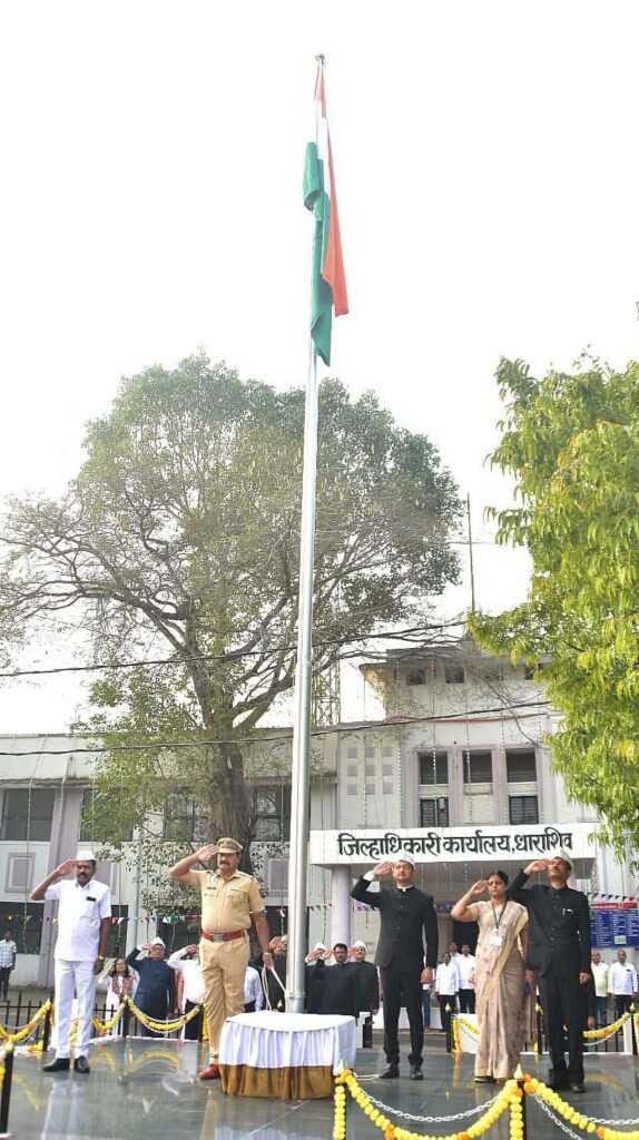 धाराशिव – भारतीय प्रजासत्ताक दिनानिमित्त आज जिल्हाधिकारी कार्यालयाच्या प्रांगणात जिल्हाधिकारी कीर्ती किरण पुजार यांच्या हस्ते राष्ट्रध्वजारोहण करण्यात आले.यावेळी राष्ट्रगीत व राज्यगीत सादर करण्यात आले. ध्वजारोहणानंतर जिल्हाधिकारी श्री.पुजार यांनी स्मृतीस्तंभास पुष्पचक्र अर्पण करून अभिवादन केले.