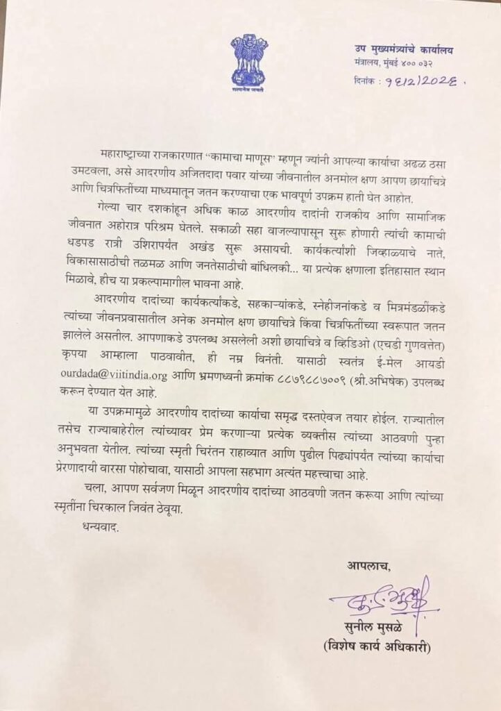 महाराष्ट्राच्या राजकारणात ‘कामाचा माणूस’ म्हणून ज्यांनी आपल्या कार्याचा अढळ ठसा उमटवला, असे आदरणीय अजितदादा पवार यांच्या जीवनातील अनमोल क्षण आपण छायाचित्रे आणि चित्रफितींच्या माध्यमातून जतन करण्याचा एक भावपूर्ण उपक्रम हाती घेत आहोत.