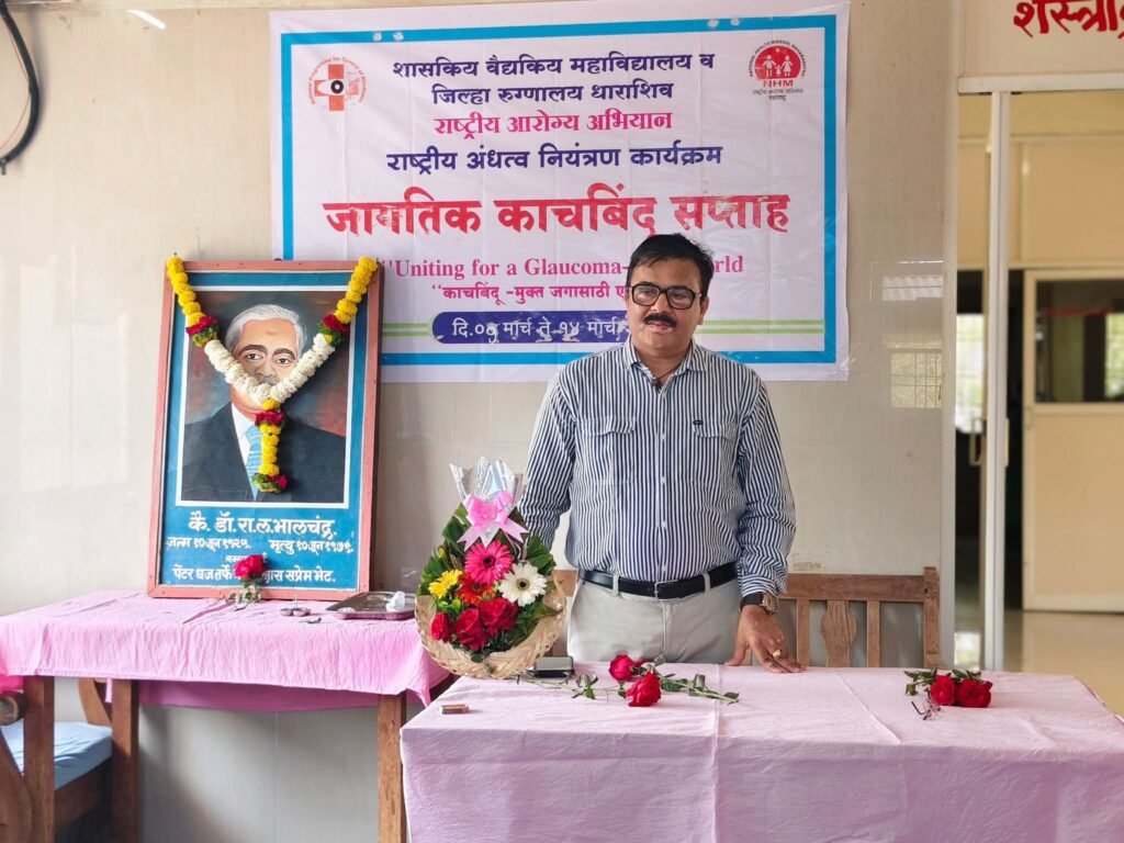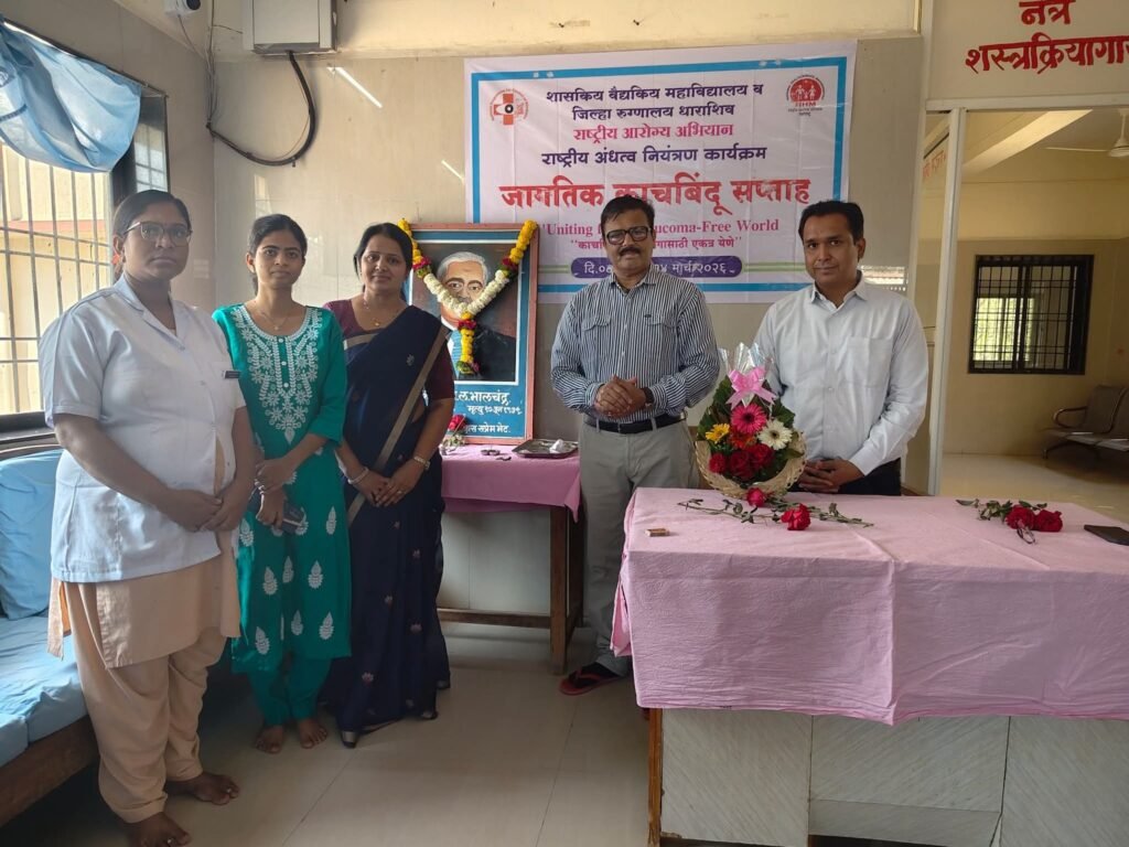 राष्ट्रीय अंधत्व नियंत्रण कार्यक्रमांतर्गत जिल्हा रुग्णालय धाराशिव यांच्या वतीने ८ मार्च ते १४ मार्च २०२६ या कालावधीत “Uniting for a Glaucoma-Free World – काचबिंदू मुक्त जगासाठी एकत्र येऊया” या घोषवाक्याखाली जागतिक काचबिंदू सप्ताह साजरा करण्यात येत आहे.या सप्ताहानिमित्त दि.९ मार्च २०२६ रोजी नेत्र विभागात जनजागृतीपर कार्यक्रमाचे आयोजन करण्यात आले.कार्यक्रमाची सुरुवात डॉ. भालचंद्र यांच्या प्रतिमेचे पूजन करून करण्यात आली.
