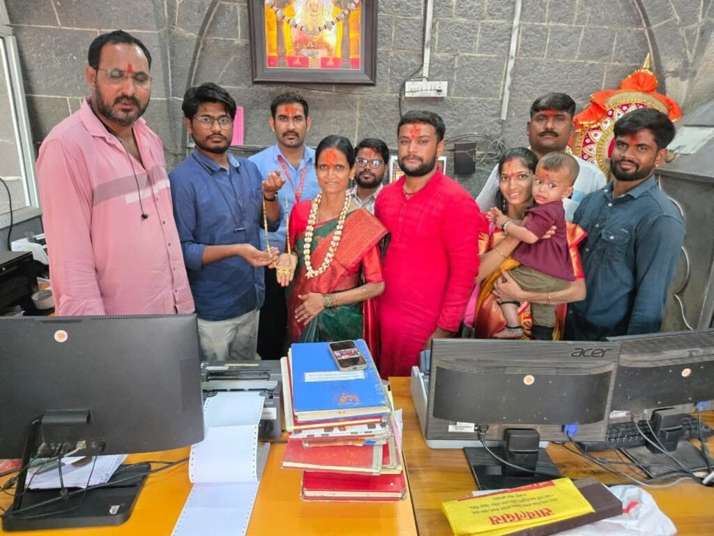 तुळजापूर : पुणे जिल्ह्यातील गणेश नगर, सोरपटवाडी येथील मनिषा अंकुश धामे यांनी आई श्री तुळजाभवानी मंदिर येथे दर्शन घेत ५१.८४० ग्रॅम वजनाचे सोन्याचे मंगळसूत्र अर्पण करून आपली श्रद्धा व्यक्त केली.