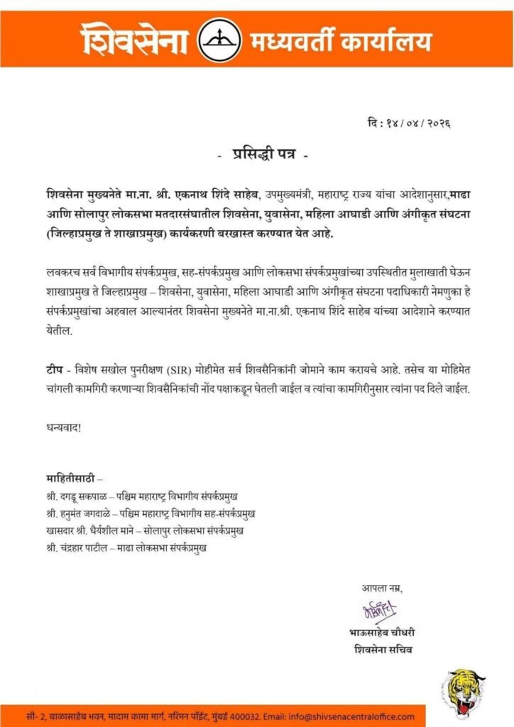 शिवसेना मुख्य नेते व उपमुख्यमंत्री एकनाथ शिंदे यांच्या आदेशानुसार माढा आणि सोलापूर लोकसभा मतदारसंघातील शिवसेना, युवासेना, महिला आघाडी आणि अंगीकृत संघटना (जिल्हाप्रमुख ते शाखाप्रमुख ) कार्यकरणी बरखास्त करण्यात येत आहे.