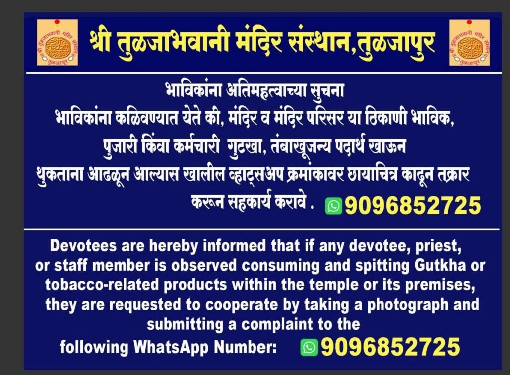 मंदिर संस्थानच्या वतीने भाविकांना आवाहन करण्यात येते की, मंदिर व मंदिर परिसर हे पवित्र तसेच सार्वजनिक स्थळ असल्याने येथे तंबाखूजन्य पदार्थांचे सेवन टाळावे. परिसरात कोणी थुंकताना आढळल्यास संबंधित व्यक्तीचा फोटो काढून ९०९६८५२७२५ या व्हॉट्सअॅप क्रमांकावर पाठवावा. प्राप्त तक्रारींवर मंदिर संस्थानच्या वतीने तत्काळ कायदेशीर कारवाई करण्यात येईल.