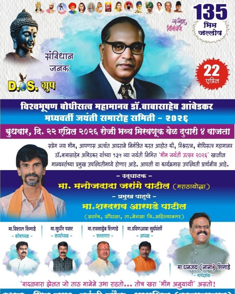 धाराशिव, – महामानव डॉ. बाबासाहेब आंबेडकर यांच्या 135 व्या जयंतीनिमित्त धाराशिव शहरात मध्यवर्ती जयंती समारोह समिती व डी. एस. ग्रुपच्यावतीने दि.22 एप्रिल बुधवारी सायंकाळी 4 वाजता मिरवणूक सोहळ्याचे आयोजन करण्यात आले आहे. भीम अनुयायी आणि नागरिकांनी मोठ्या संख्येने उपस्थित राहण्याचे आवाहन मार्गदर्शक धनंजय शिंगाडे यांनी केले आहे.