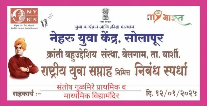 सोलापूर (बार्शी) : भारत सरकार द्वारा, युवा कार्यक्रम आणि क्रीडा मंत्रालय अंतर्गत, नेहरू युवा केंद्र, सोलापूर व क्रांती बहुद्देशीय संस्था, बेलगाव यांच्या संयुक्त विद्यमाने स्वामी विवेकानंद व राजामाता मॉंसाहेब जिजाऊ यांच्या जयंती ( राष्ट्रीय युवा सप्ताह ) निमित्त खुल्या निबंध स्पर्धेचे आयोजन संतोष गुळमिरे प्राथमिक व माध्यमिक विद्यामंदिर, बार्शी या ठिकाणी करण्यात आले आहे.